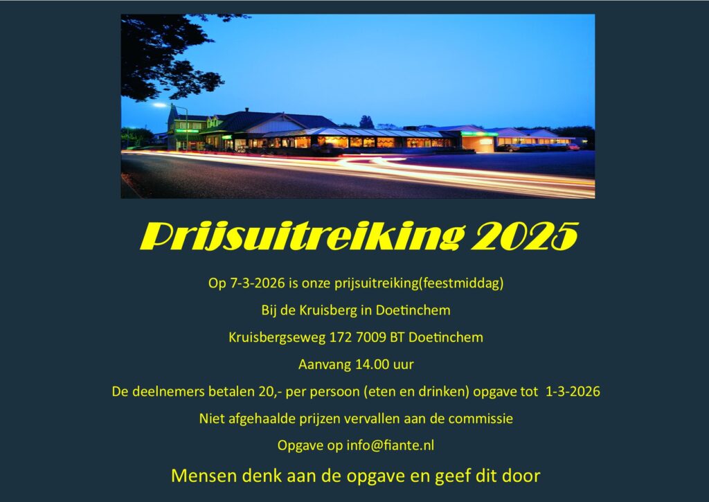 Menu Nieuws Upd.18-07-2023 Inkorfinstructie 2022. Hoofdprijzen 2025. Uitslagen per Afd.2025 Feestmiddag 2020 Poulebrief Fiante Archief Uitslagen + Kamp.2024 Uitslagen + Kamp.2023 Uitslagen + Kamp.2022 Uitslagen + Kamp.2021 Uitslagen + Kamp.2020 Uitslagen + Kamp.2019 Uitslagen + Kamp.2018 Uitslagen + Kamp.2017 Uitslagen + Kamp.2016 Uitslagen + Kamp.2015 Dit is alleen voor liefhebbers die Fiante gekorfd hebben.